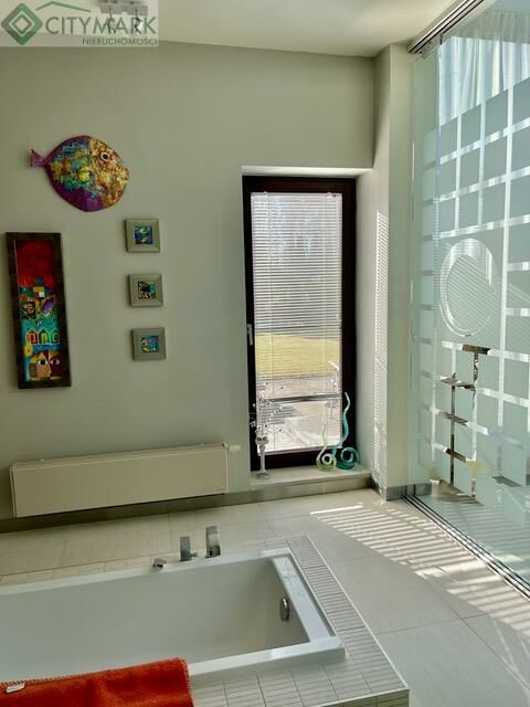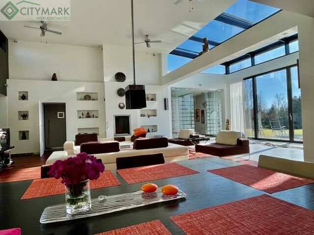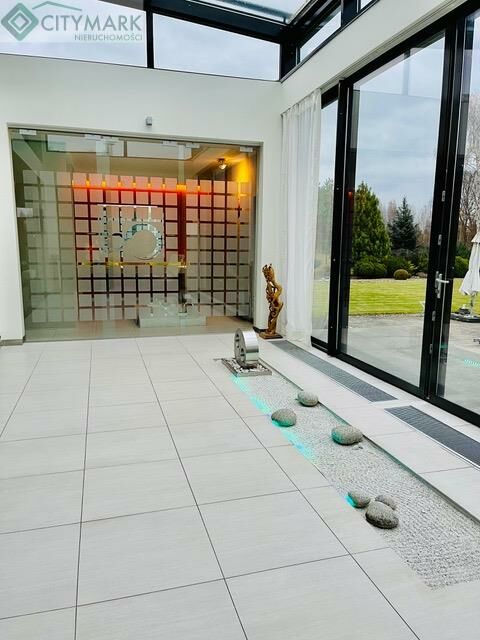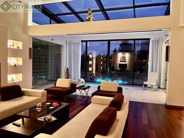 Interesującym elementem nieruchomości jest szklana elewacja w salonie, z drzwiami otwierającymi na ogród.